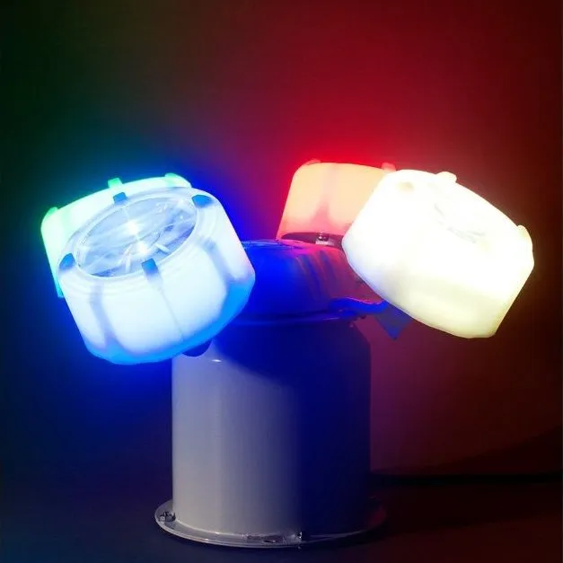 American DJ Rotobeam 4 Спецэффект 4-головочный «вертолетный» с непрерывным вращением на 360˚. Вращение лучей и стробоскопический эффект в такт музыке, 4 x светодиода (1 красный, 1 зеленый, 1 синий и 1 белый) мощностью 3 Вт каждый , Работает всю ночь – нет ограничений на продолжительность включения, Совместимость с ИК-пультом дистанционного управления ADJ UC-IR (продается отдельно) Режим ожидания (Затемнение), Полное включение, Выбор цвета, Стробоскопический эффект, Звук и Регулировка яркости, Автопрограммы с различными цветовыми рисунками (не выбираются пользователями), Скорость вращения: переменная, Включает одиночную вилку для монтажа на стене или ферме, Работа с разными напряжениями: 100-240 В пер. т, 50/60 Гц (автоопределение), Потребляемая мощность: 19 Вт, Габариты (ДxШxВ): 223 x 223 x 230 мм. Масса: 3 кг.