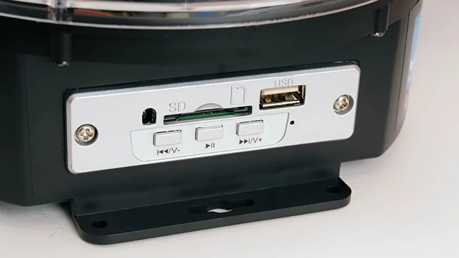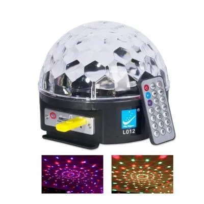 6 светодиодов различных цветов (красный, зеленый, синий, белый, оранжевый, розовый). Прочный пластиковый корпус. 82 мощных световых луча. Эффект «диско-шара». Встроенный проигрываткель MPЗ с USB-флешек с динамиком. Пульт дистанционного управления. USB разъем для подключения MP3-плеера. Срок службы 50,000 часов. Управление: звуком/автоматический/MP3-плеер/пульт ДУ. Размеры 195х195х170 мм. Вес 0.65 кг.