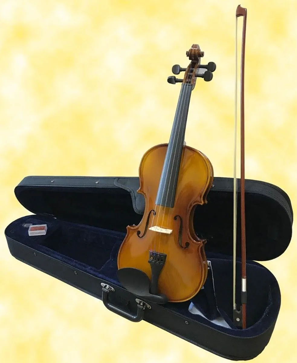Brahner BV-412 1/10 Скрипка 1/10 в комплекте: кейс, смычок, канифоль. Верхняя дека – резонансная ель, нижняя дека и обечайка – клен, гриф – клен, накладка на грифе – черные, колки и подбородник – черные, струнодержатель металл с 4-мя машинками, подставка клен, покрытие лак. В комплекте кейс и смычок.